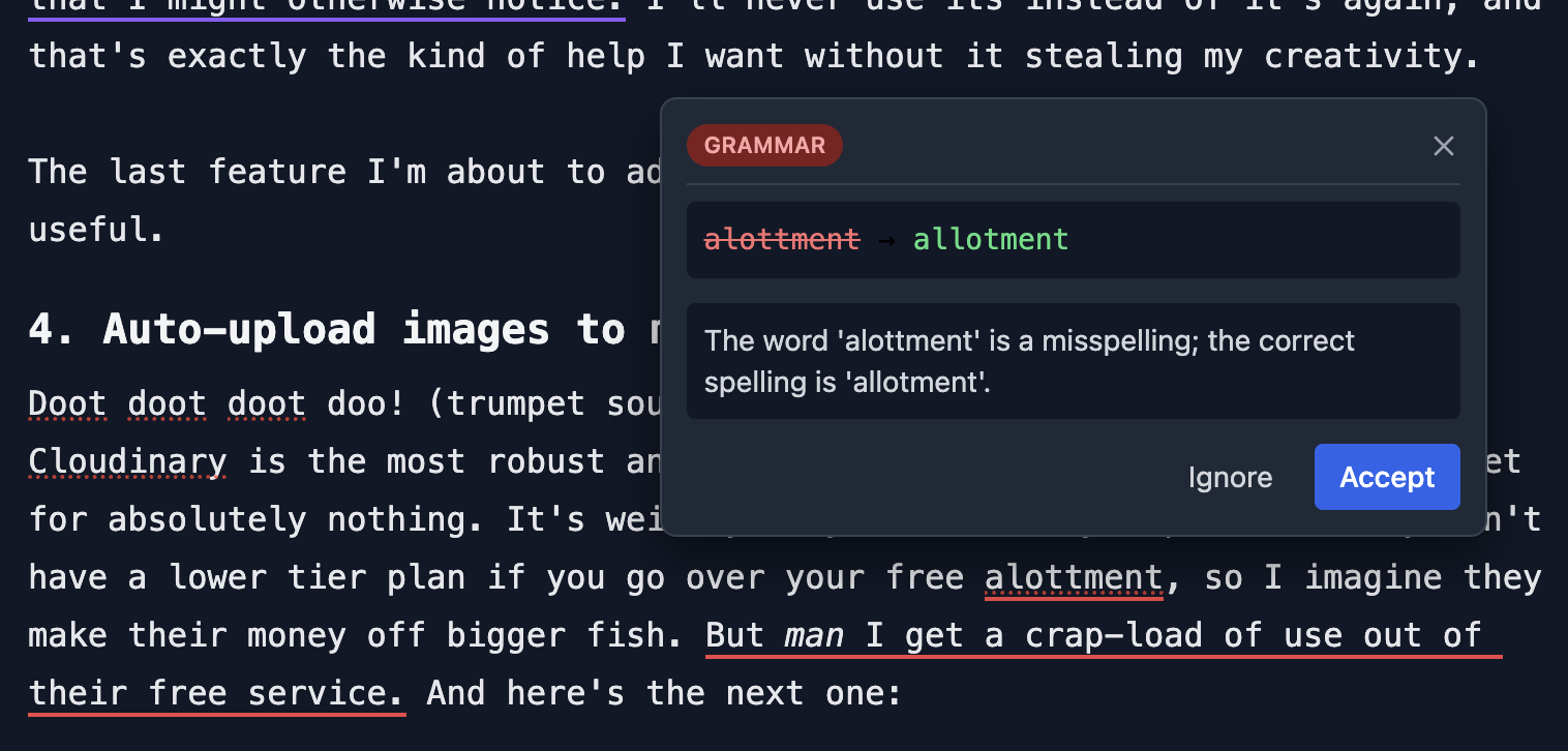 I have not built this yet, but by the time I finish this post, I intend to implement a way to drop images into the editor where I want them to appear (or pressing cmd+v at the cursor location) and for that image to be uploaded to Cloudinary so it will be embedded in the post. I am pretty sure this is possible, but if not, I will add a Cloudinary uploader as the next best option.