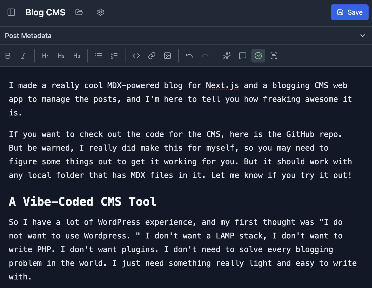 If you want to check out the code for the CMS, here is the GitHub repo. But be warned, I really did make this for myself, so you may need to figure some things out to get it working for you. But it should work with any local folder that has MDX files in it. Let me know if you try it out!