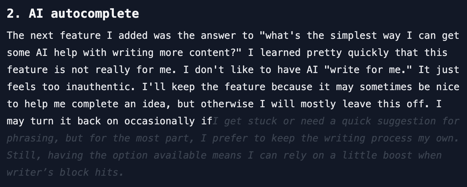 The next feature I added was the answer to "what's the simplest way I can get some AI help with writing more content?" I learned pretty quickly that this feature is not really for me. I don't like to have AI "write for me." It just feels too inauthentic. I'll keep the feature because it may sometimes be nice to help me complete an idea, but otherwise I will mostly leave this off.