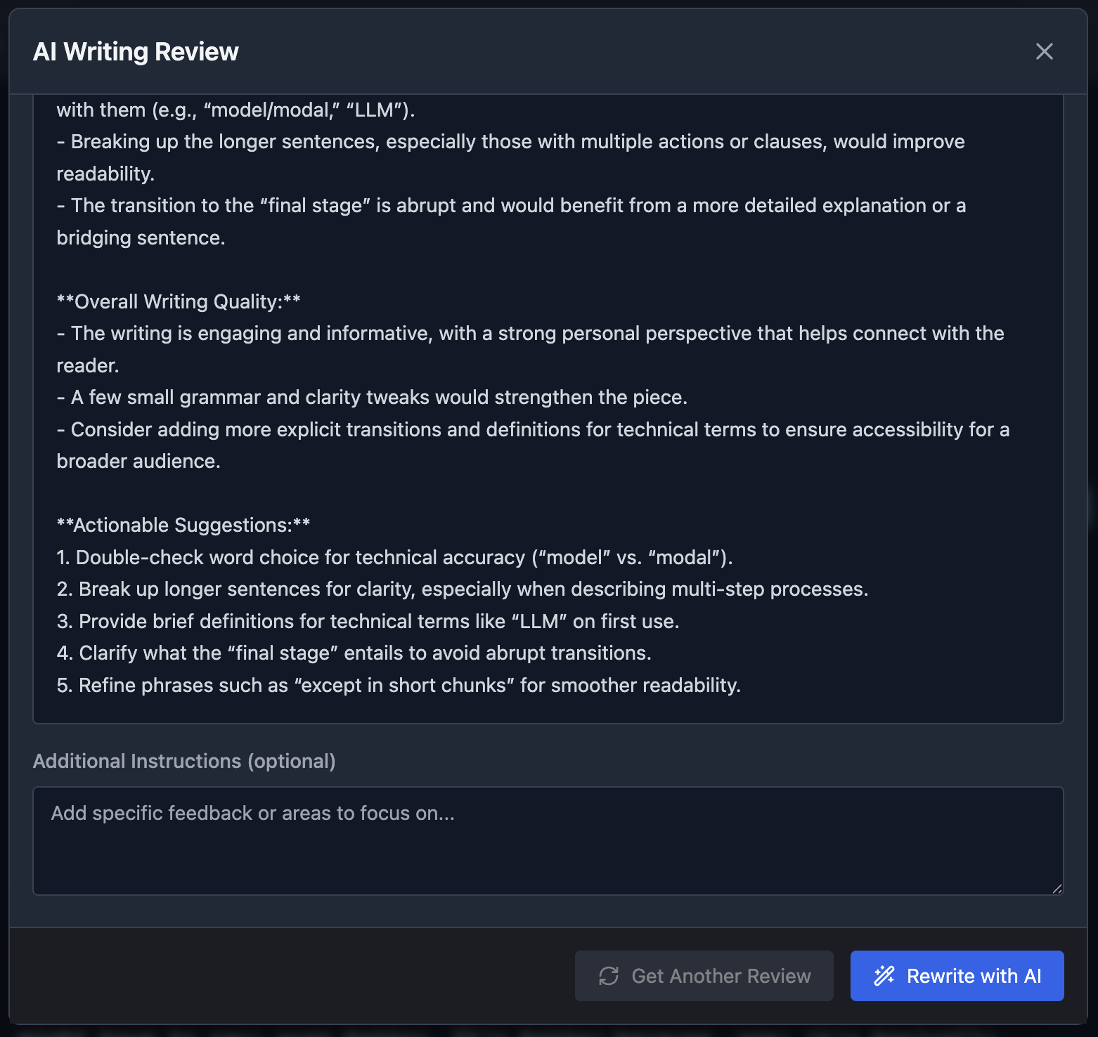 Since AI autocomplete doesn't really do it for me, I wanted to at least save myself the step of pasting into ChatGPT to get feedback and potential rewrites, so I made a feature that lets me do that within the editor. Here's how it works: I can select some text, or select nothing if I want a full post review, then click the "review" button. A model opens, and after a pause, I get a set of notes back from an LLM. I can provide feedback on the notes to revise them as many times as needed until I receive feedback I'm happy with. From there, I also have the option of letting the AI rewrite the selected content.
